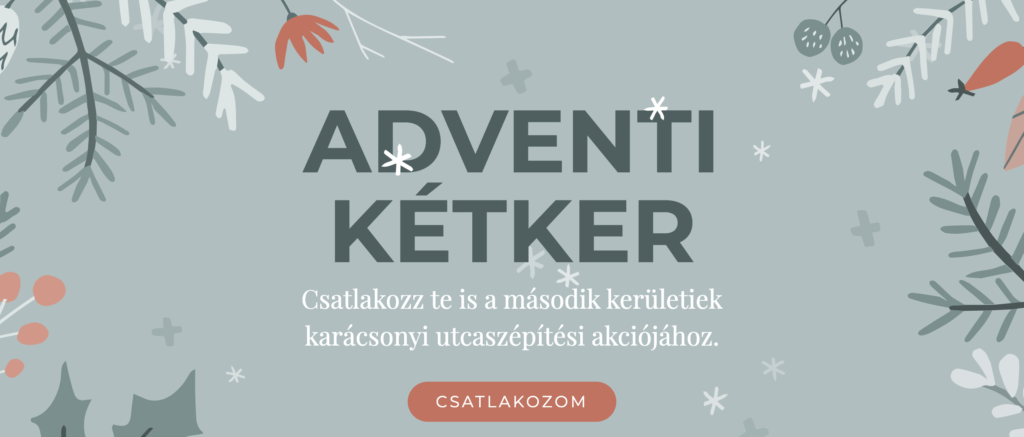 Csatlakozz te is a második kerületiek karácsonyi utcaszépítési akciójához. Lelkes helyi lakók összefogtak és egy szuper kezdeményezést indítottak útra, az Adventi Kétkert. Az ünnepi hangolódást szeretnék támogatni és egy alulról szerveződő, városszépítő kampányt indítottak el. Mottójuk: A lélek ünnepi felkészítéséhez nagyban hozzájárul a környezet hangulatossá tétele. Egy szép kapudísz, egy kedves kirakat látványa mindenkit jó érzéssel tölt el.